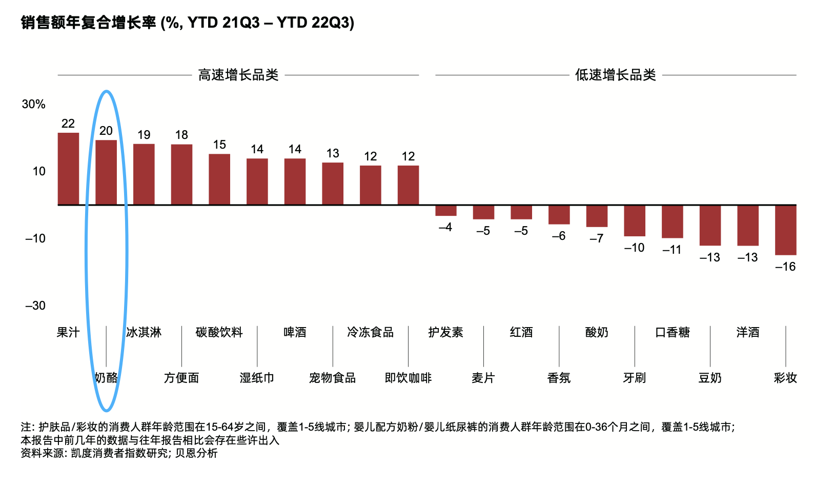 根据凯度消费者指数与贝恩公司联合发布的报告,自2021年三季度至2022年3季度的一年当中,奶酪品类的增速达到20%,在该报告监测的20个商品品类中增速排第二。