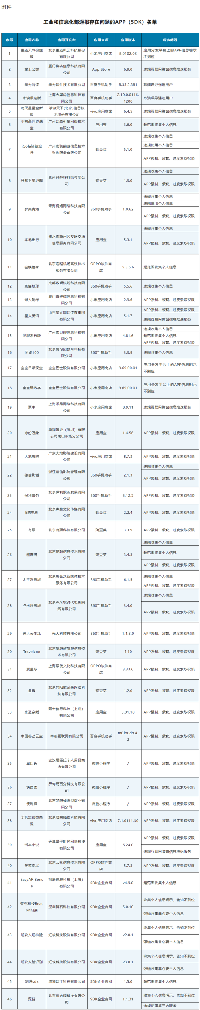 工信部2月8日消息,依据《个人信息保护法》《网络安全法》《电信条例》《电信和互联网用户个人信息保护规定》等法律法规,工信部组织第三方检测机构对群众关注的生活服务类移动互联网应用程序(APP)及第三方软件开发工具包(SDK)进行检查。发现46款APP(SDK)存在侵害用户权益行为,现予以通报。上述APP及SDK应在2月15日前完成整改落实工作。逾期不整改的,工信部将依法依规组织开展相关处置工作。