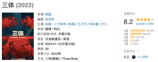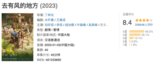 剧集口碑热度成绩显著。“高口碑+高热度”是Q1头部剧集的标配。截至稿前,《狂飙》《去有风的地方》《三体》的豆瓣评分分别是8.6分、8.4分、8.2分,与之对应的是,这三部剧集入围了灯塔专业版1月全网正片播放市占率与舆情热度两大榜单的TOP5。