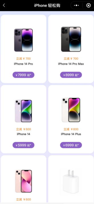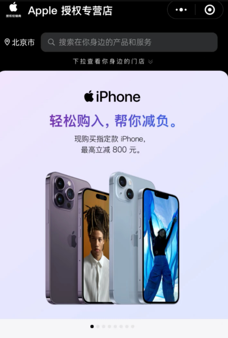 而上述降价消息也于近日正式落地。时代周报记者发现,虽然目前在苹果公司官网最新机型iPhone 14 Pro、iPhone 14 Pro Max两款产品价格均保持不变,但进入到微信小程序的Apple授权专营店,即可看到“现购买指定款iPhone,最高立减800元”的宣传图,iPhone 14 Pro系列降价700元,iPhone14、iPhone 14 Plus有600-800元的降价幅度。同时,在部分电商平台上也有一定的降价促销。