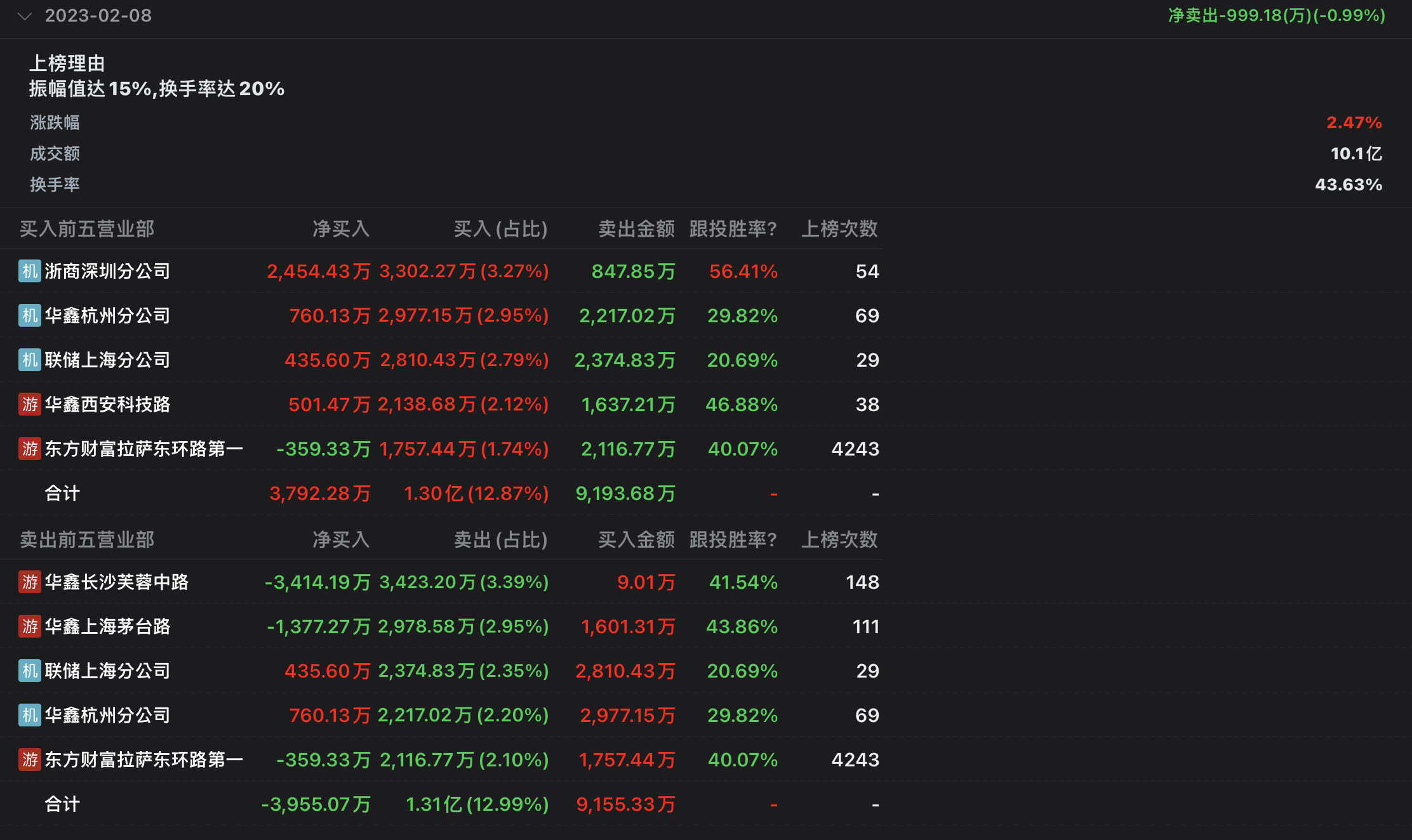 2月8日,华锋股份今日涨2.47%,龙虎榜数据显示,上榜营业部席位全天成交3.02亿元,占当日总成交金额比例为29.92%。其中,买入金额为1.46亿元,卖出金额为1.56亿元,合计净卖出999.18万元。