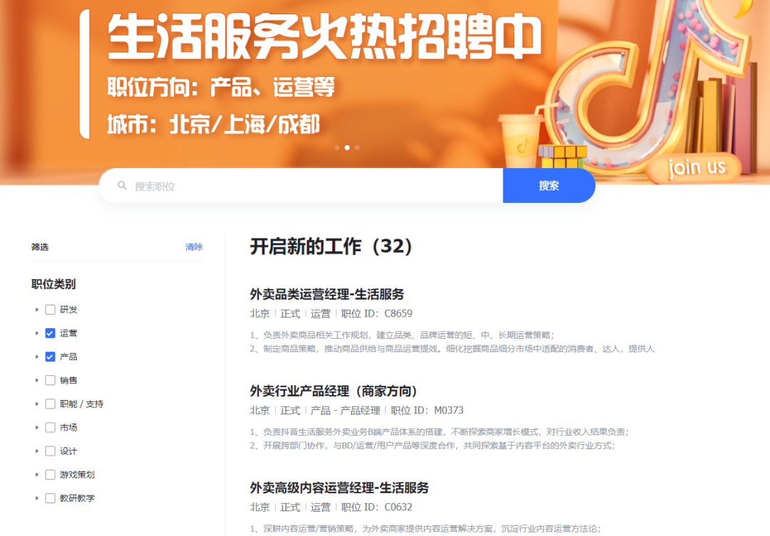 此外,字节跳动招聘官网,现已挂出了外卖品类运营经理、外卖行业产品经理、外卖高级内容运营经理等相关职位。