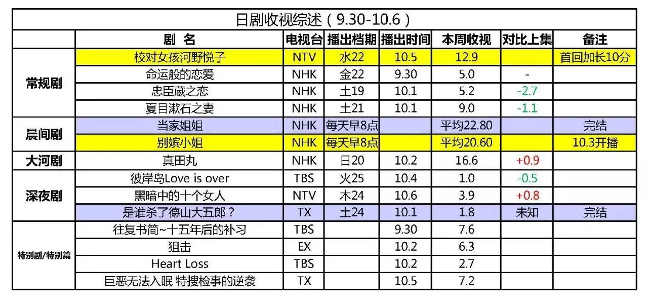 本轮又播出了好几部SP,但都成绩平平。由松下奈绪和市原隼人出演的《往复书简~十五年后的补习》,改编自凑佳苗的小说(真的好高产……),口碑并不是很好,剧情散,节奏慢是主要被诟病的原因。另一部SP《狙击》,尾野真千子化身帅气女刑警,与《特搜检事的逆袭》一样属于探案悬疑类,口碑暂不明朗。而由齐藤由贵、川岛海荷出演的《Heart Loss》由于在午间播出,所以收视更加不理想。