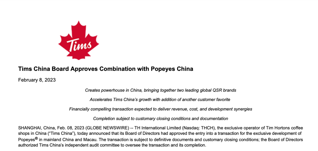 刚刚,在美国上市的Tims天好中国发出了有关其董事会批准和Popeyes(曾译名:博派斯)中国合并的公告。公告表示,Tims天好中国董事会已批准了一项关于在中国大陆和澳门独家发展Popeyes的交易,该交易的完成仍取决于最终文件和惯例成交条件。