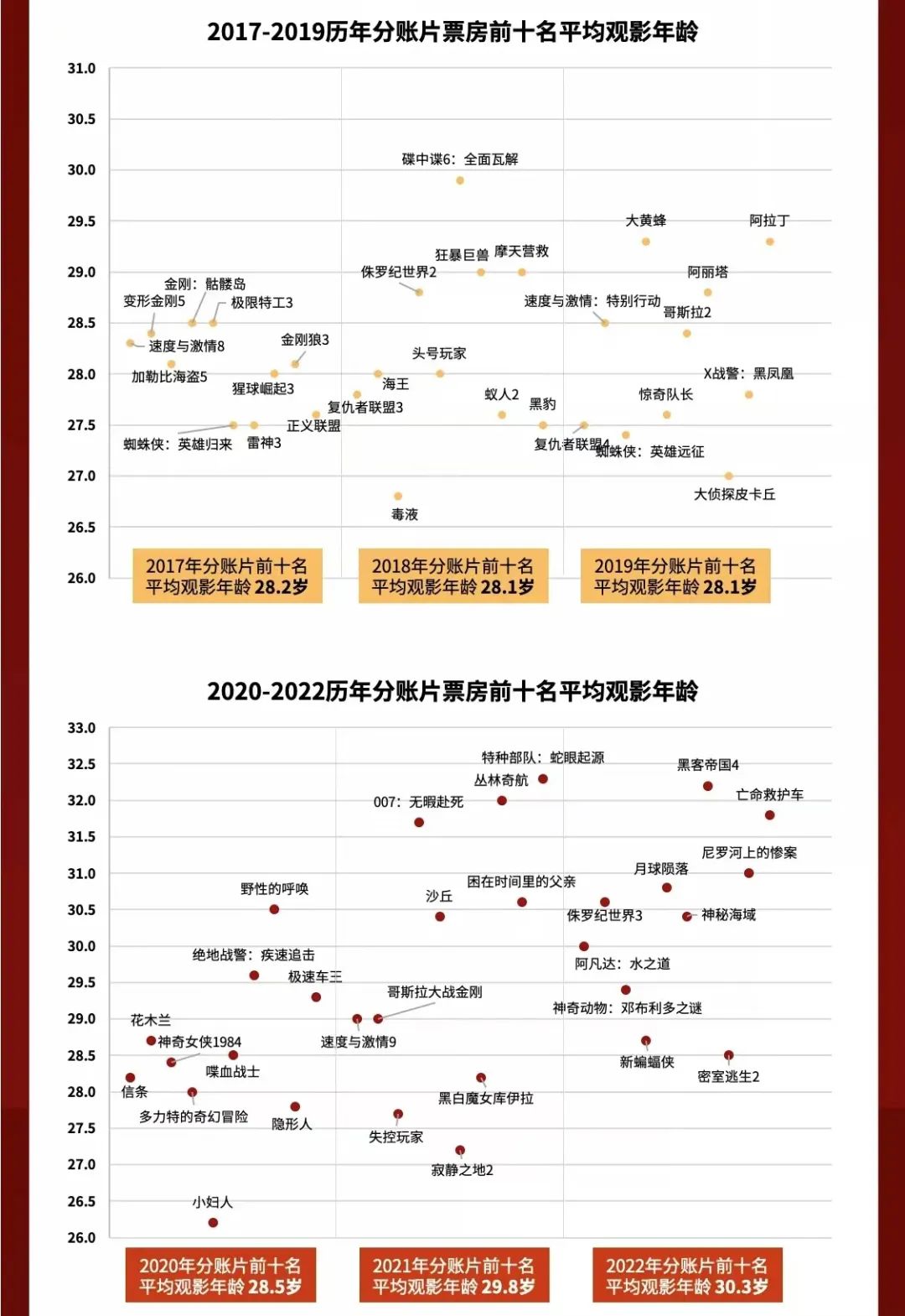根据猫眼研究院发布的《2022中国电影市场数据洞察》,2017-2019年进口分账片前十名的平均观影年龄为28岁,而2022年进口分账片前十名平均观影年龄已达到30.3岁。这意味着三年间分账电影的主要受众人群并没有发生改变,主要增量年轻观众出现了明显缺失。