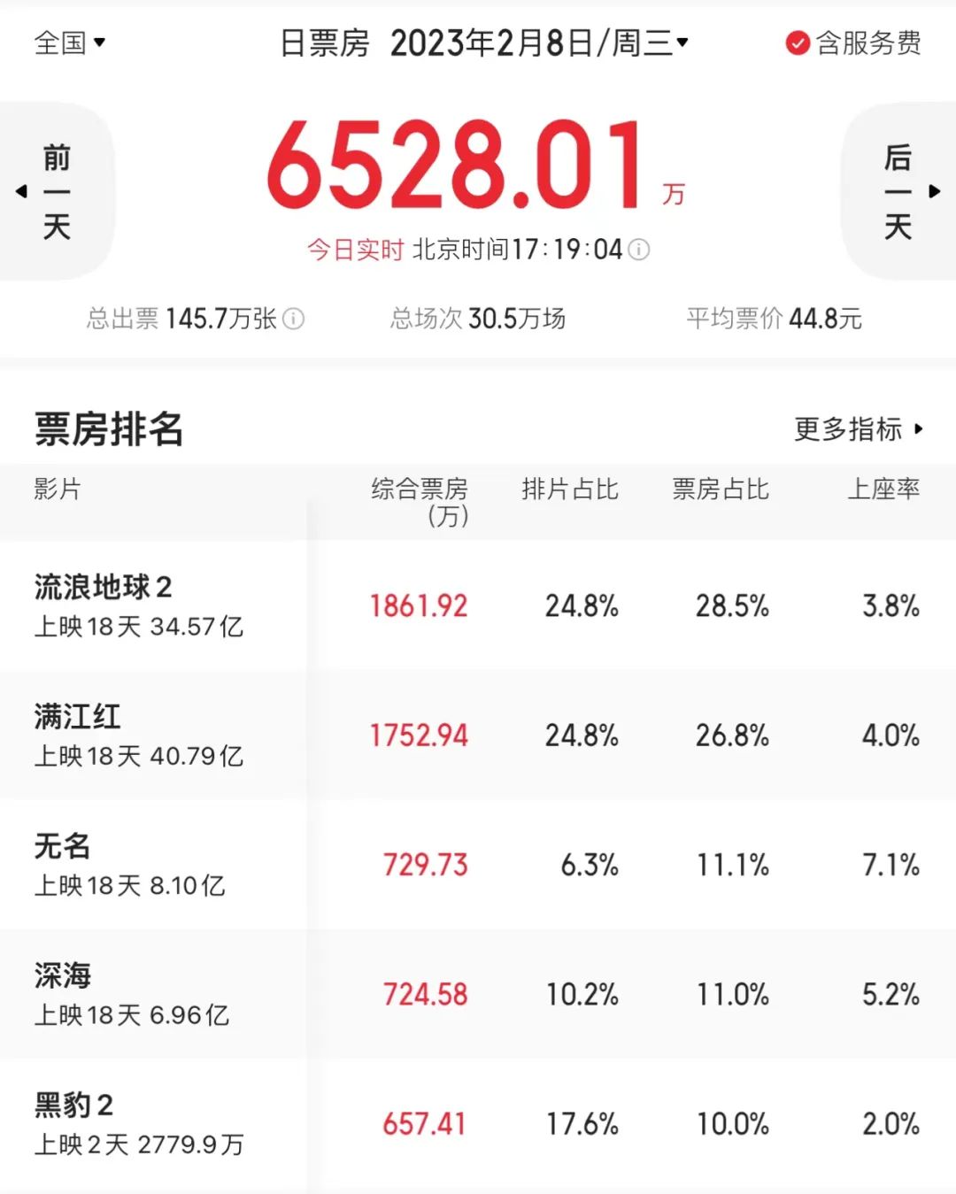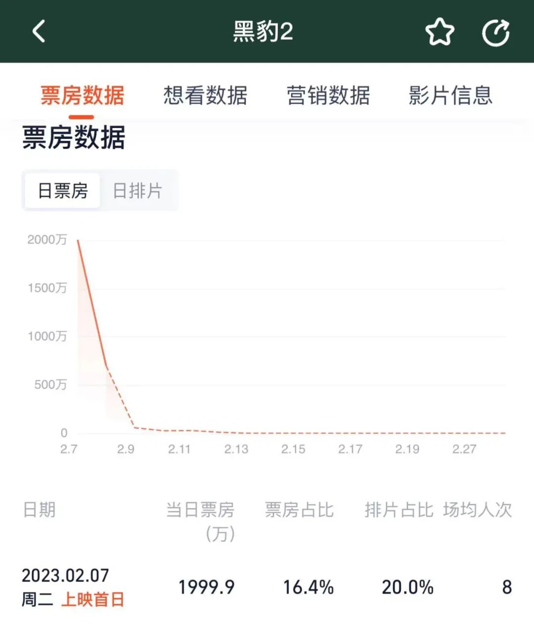 截至2月8日17时,上映不过两天的《黑豹2》日票房已经被春节档四部影片反超。