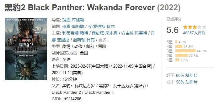 由于文化差异问题,中国观众对《黑豹》系列的观影热情一直不算强,即便是在疫情前的2018年,《黑豹》也只拿到了6.62亿元票房。远低于同年上映的《蚁人2:黄蜂女现身》和《毒液》这两部单人电影。口碑方面,《黑豹》系列同样在其他漫威IP中较低,像此次的《黑豹2》豆瓣评分已跌至5.6,距离口碑垫底的《雷神4》也就仅差0.2分了。