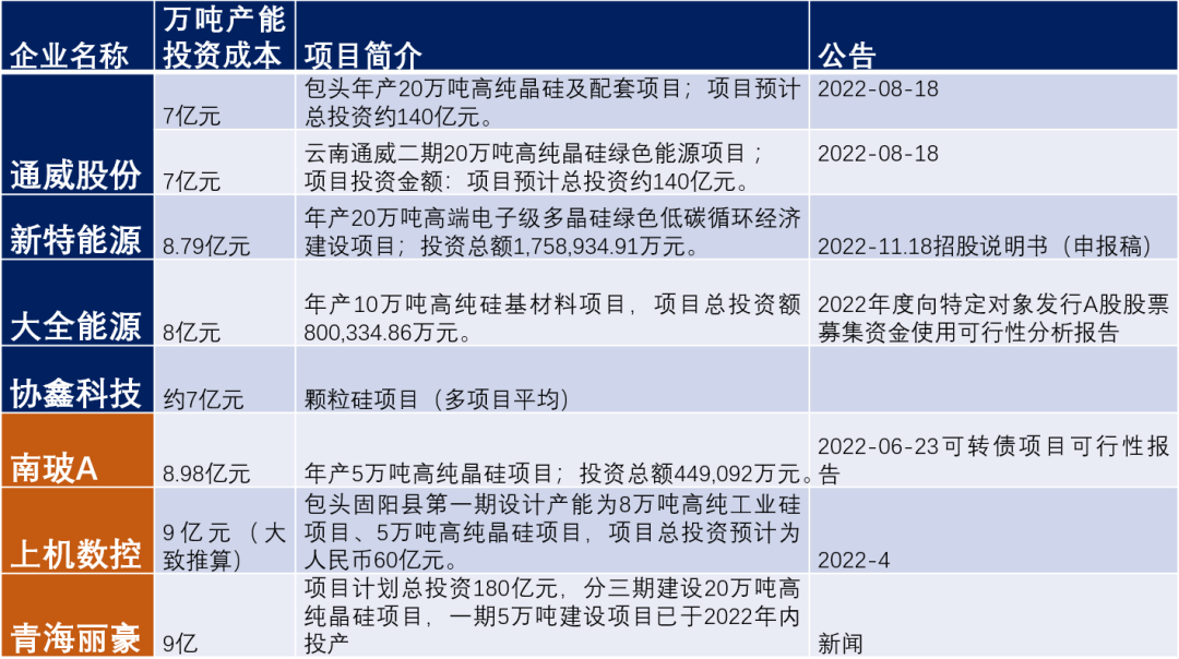 大全能源、新特能源(港股公司,拟在A股上市)的主业也是硅料。大全能源拟发行定增,年产10万吨多晶硅料的募投项目,平均每万吨产能的投资成本为8亿元。