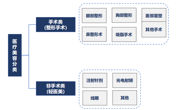 按照介入手段划分,医美又可以分为手术类、非手术类(又成轻医美)两大类。手术类医美出现较早,是目前全球接受度较高的医美技术;轻医美起步晚,但发展迅速,将是短期内医美产业发展的核心动能。