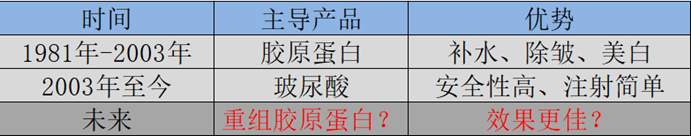 玻尿酸隶属于注射填充这一分类,但在2003年之前,注射填充这一医美领域则是被胶原蛋白所独占。然而,由于过往的胶原蛋白来源于动物,很容易产生免疫原性,造成过敏等问题,因此产品的安全性并不高。