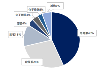 首先,肉毒素在国内市场中是一个被低估的赛道,甚至在海外它有着超越玻尿酸的市场规模,全球医美市场中43%的份额被肉毒素所占据,而玻尿酸仅为28%。与全球数据相比,国内玻尿酸市场显著压制肉毒素,2021年玻尿酸的市场规模为64亿元,而肉毒素仅为46亿元。