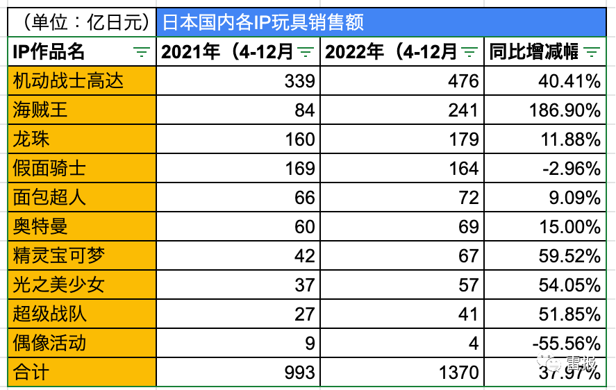 如果仅看日本国内各IP玩具的销售情况,其4-12月销售额达到了1370亿日元,较上年同期大增37.97%。期中海贼王的销售额也绝对亮眼,以其186.09%的增长幅度位居top2。机动战士高达IP的影响力依然持久,一直保持在销售额的第一位。