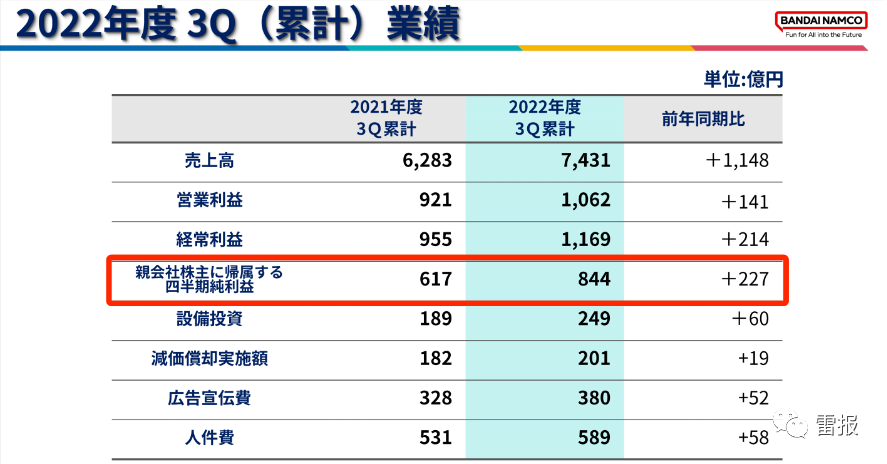 2月7日,万代南梦宫发布了2022年度前九个月的合并财报(实际时间为2022年4月1日-12月30日),其销售额和利润都实现了增长。万代共实现销售额7431.87亿日元(约合人民币385.45亿元),同比增长18.3%;归属于母公司股东的当期净利润为844.44亿日元(约合人民币43.8亿元),同比增长36.9%,较上年同期大增227亿日元。