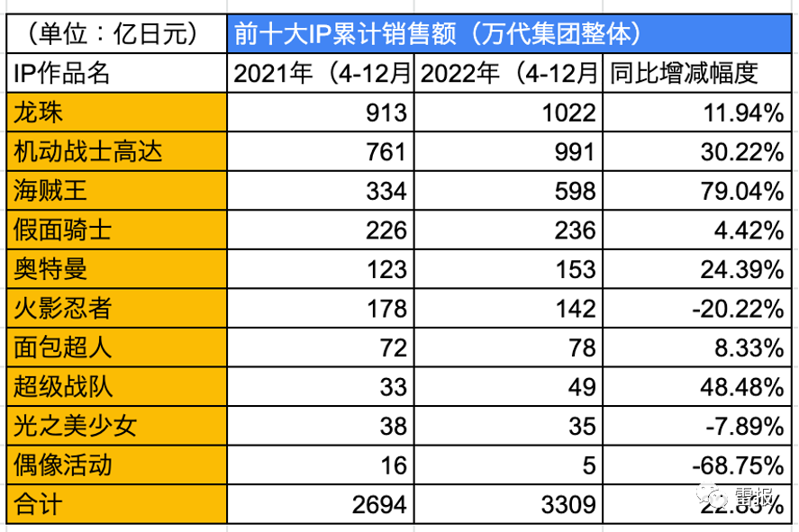 机动战士高达,龙珠,海贼王三大IP势头强劲,前十大IP总体销售额3309亿日元