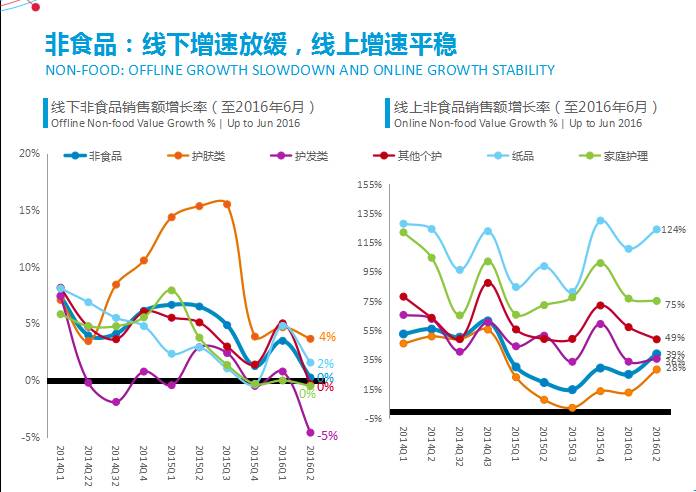 显然,线上的增长率虽有所放缓,但截止2016年上半年仍能保持较高的百分比,带动了整个日化类的增长。