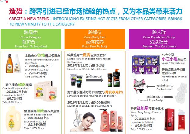 唐东表示,渠道、信息的进一步流通,为新趋势的引进提供了更多的方法,如跨国公司从国外引进新品,厂商跨界引进其他品类,都有望缩短创造风口的时间。而跨品类,食护合一;跨部位,面部跨界;跨人群,受众细分等新的营销手法成为热点。如上海家化推出的谷物精华餐具净、一叶子植物酵素面膜、强生婴儿燕麦滋养沐浴露等均采用市场已经检验的热点食品,推出热点产品并获得关注。巴黎欧莱雅男士的炭爽功能以洗面奶产品为主,却在2015年6月推出炭爽去油洗发水。