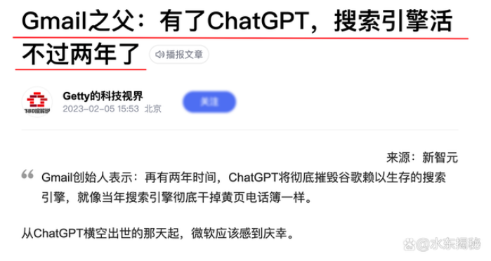 这么看来,ChatGPT最能威胁的,其实并非文字工作者,而是搜索引擎,随着人工智能的加入,当下的搜索模式或还会出现大变化,Gmail创始人甚至表示搜索引擎将活不过两年。