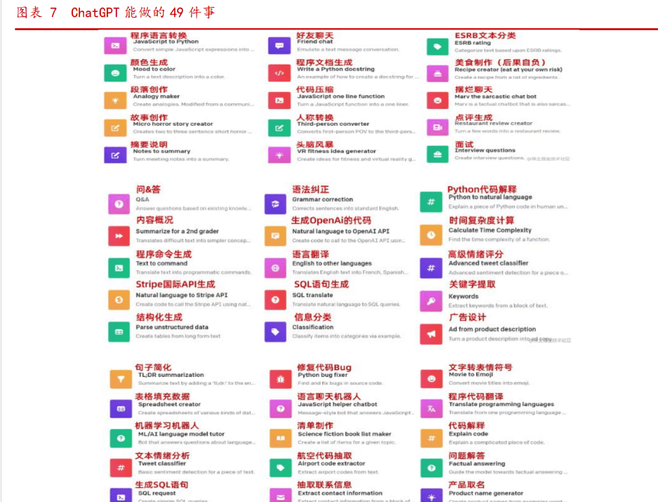 华西证券在ChatGPT相关报告中列出了其能做的49件事,涉及教育、科研、游戏、新闻等领域,前景广阔,当前资本也加速押注与ChatGPT相关的大规模预训练模型赛道。