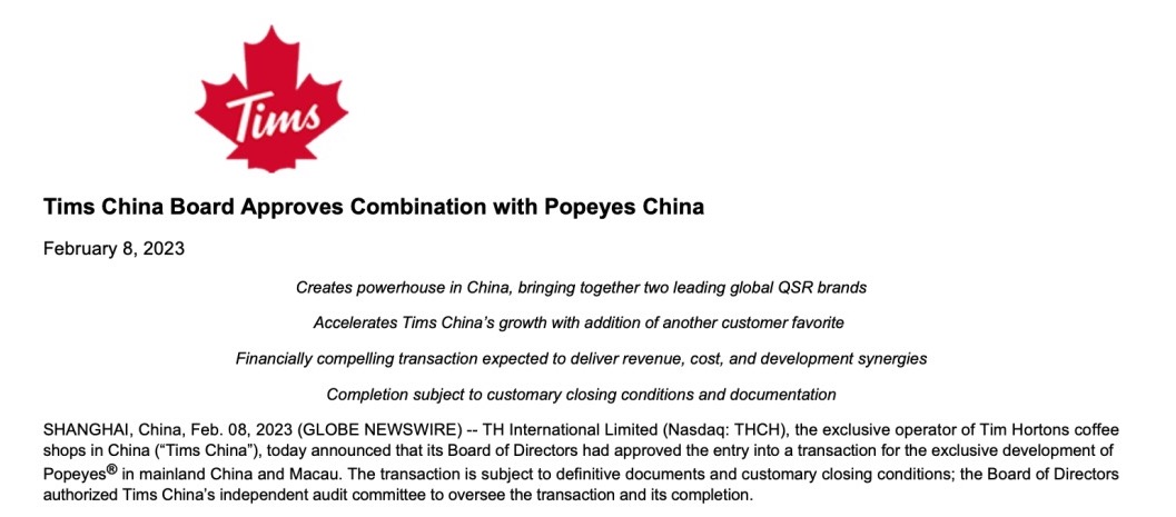 Tims天好中国称,这份不具约束力条款清单也为其和Popeyes中国合并奠定了基础。此次合并是一项极具财务吸引力的交易。