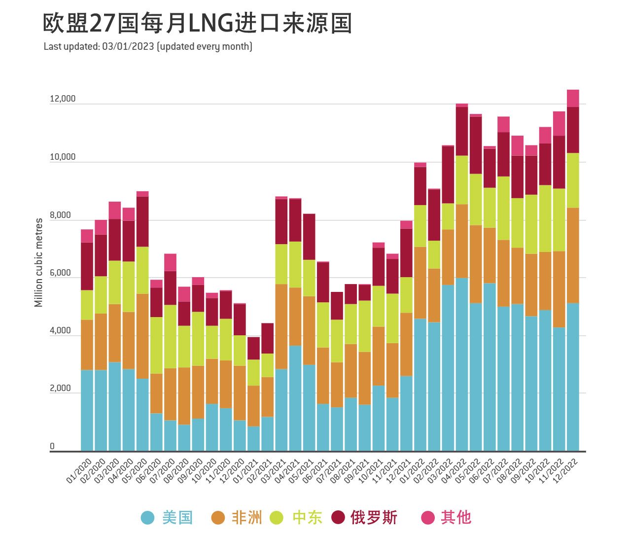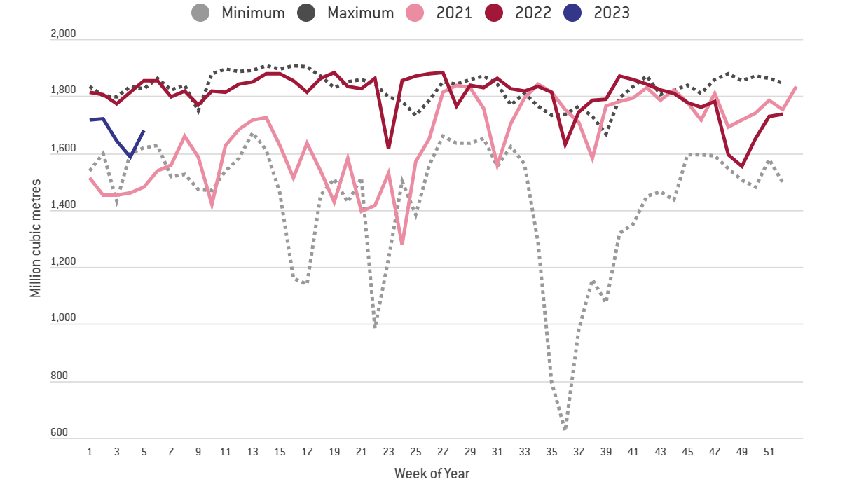 根据欧盟天然气运输系统运营商数据,截至2月7日的当周,俄罗斯向欧盟出口天然气4.41亿立方米,较去年同期低77%,仅为2021年同期的14%。