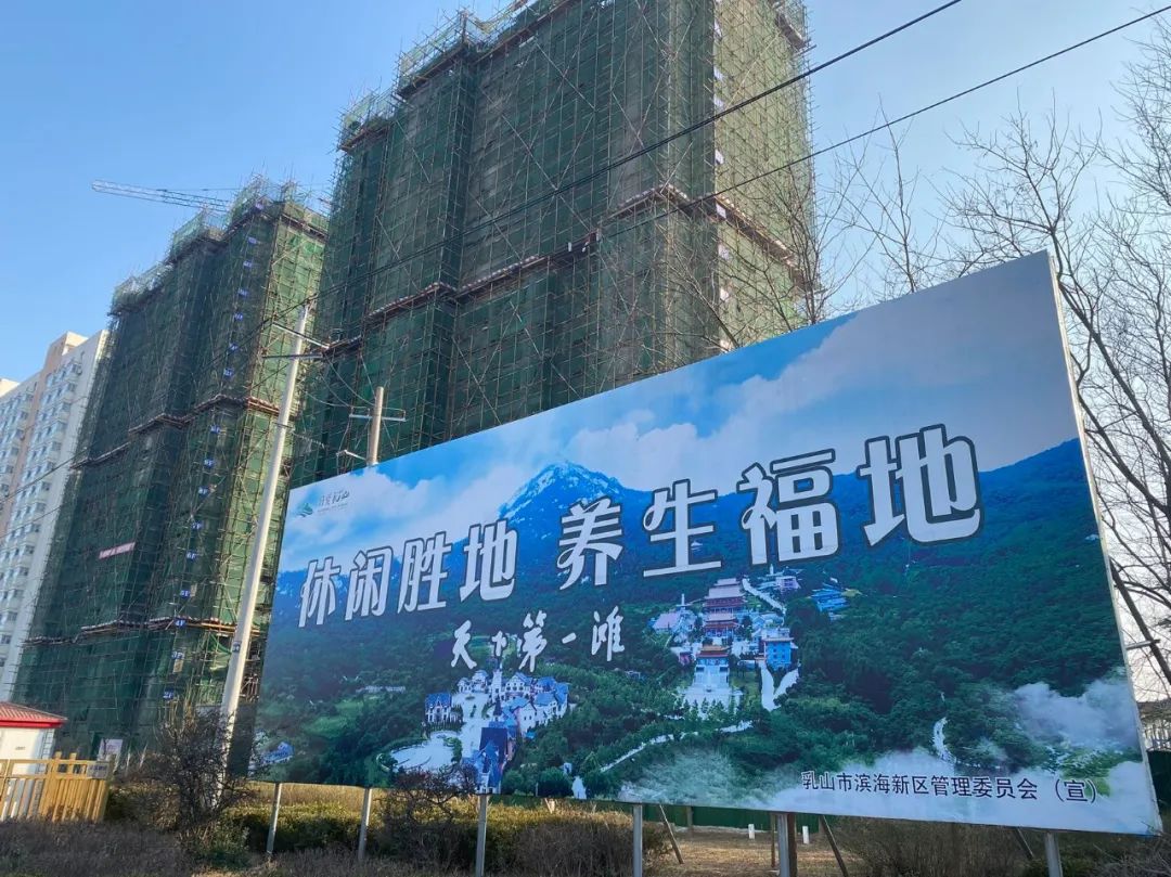 在这座山东东部的海滨小城里,地产开发不休不眠。爱琴海景小区的50多栋楼中,仍有两栋高层正在建设。小区马路对面,一座新房售楼处也已伫立许久。更远处,几栋围着绿色防尘布的楼栋高耸在晨光中,巨大的广告牌上写着:“选择了乳山,选择了未来。”