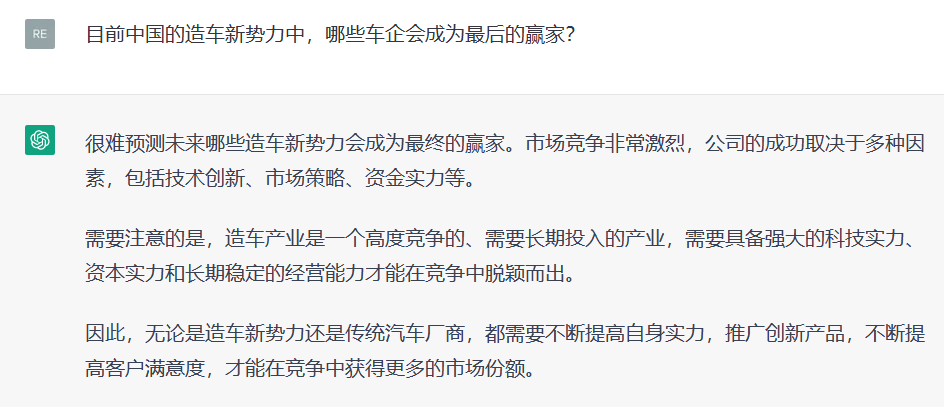 ChatGPT: 很难预测未来哪些造车新势力会成为最终的赢家。市场竞争非常激烈,公司的成功取决于多种因素,包括技术创新、市场策略、资金实力等。