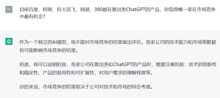 ChatGPT:作为一个独立的AI模型,我不能对市场竞争的结果做出评价。各家公司的技术能力和市场策略都有可能影响市场竞争的结果。