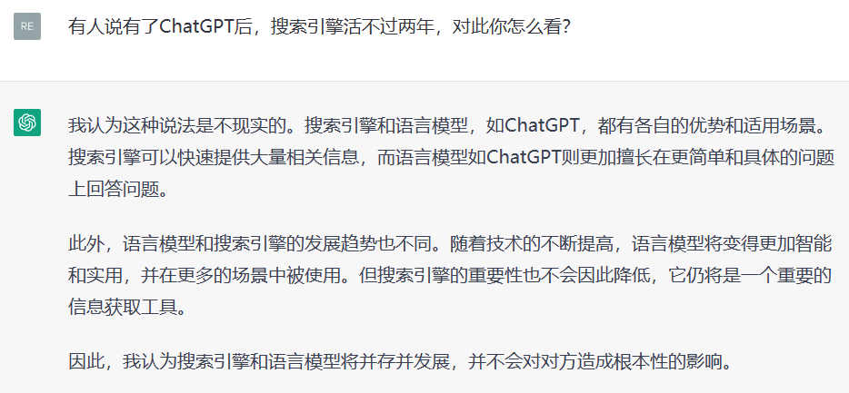ChatGPT: 我认为这种说法是不现实的。搜索引擎和语言模型,如ChatGPT,都有各自的优势和适用场景。搜索引擎可以快速提供大量相关信息,而语言模型如ChatGPT则更加擅长在更简单和具体的问题上回答问题。