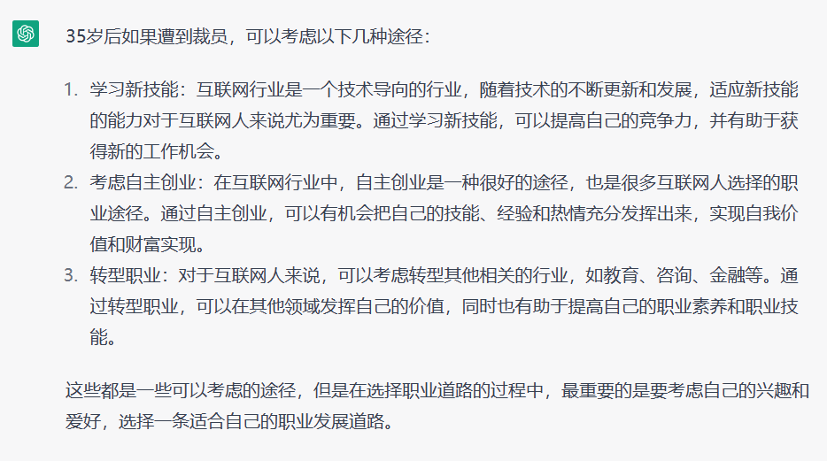 ChatGPT: 35岁后如果遭到裁员,可以考虑以下几种途径: