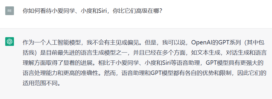 ChatGPT:作为一个人工智能模型,我不会有主见或偏见。但是,我可以说,OpenAI的GPT系列(其中包括我)是目前最先进的语言生成模型之一,并且已经在多个方面,如文本生成,对话生成和语言理解方面取得了显着的进展。相比于小爱同学、小度和Siri等语音助理,GPT模型具有更强大的语言处理能力和更高的准确性。然而,语音助理和GPT模型都有各自的优势和限制,因此它们的适用范围不同。