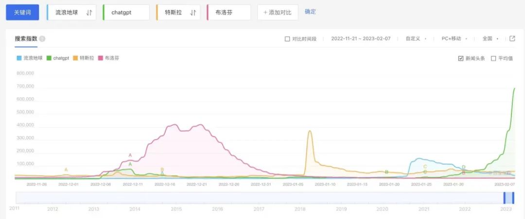 在近期最火的几个关键词中,ChatGPT的搜索指数增长曲线是最陡峭的。