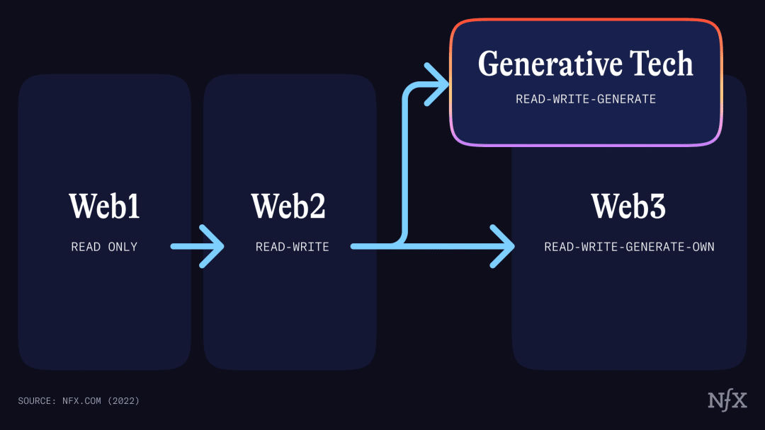 如果 Web1 是“只读”,Web2 是“读写”,生成式技术是“读写-生成”,那么 Web 3 就是“读写-生成-拥有”。生成式技术现在与Web3并行发生,并且发展速度更快。如果加密技术没有诞生,我们可能会把生成式技术命名为web3。