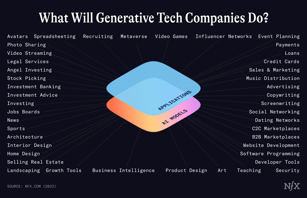 当一个新的行业像这样开放时,创始人通常可以比在更容易理解并因此更具竞争力的领域更容易找到容易实现的成果。生成式技术将具有不同寻常的市场动态,因为它已经达成共识。