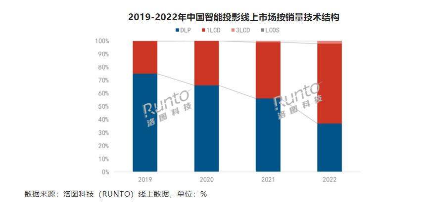 由于,2022年智能投影市场DLP“萎缩”之不到4成份额,而1LCD则上升到6成左右。这也就是说,去年智能投影市场的超百万台的增量空间,基本上就是1LCD智能投影在支撑。