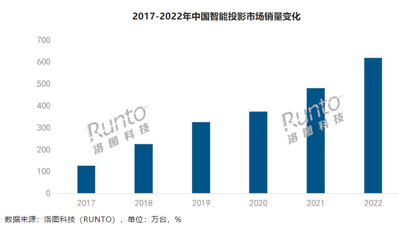 可以看到,2022年,智能投影再度一路飙升,连续5年保持年度新增百万台的“高增长”,成功突破600万台大关,再创销量新高。