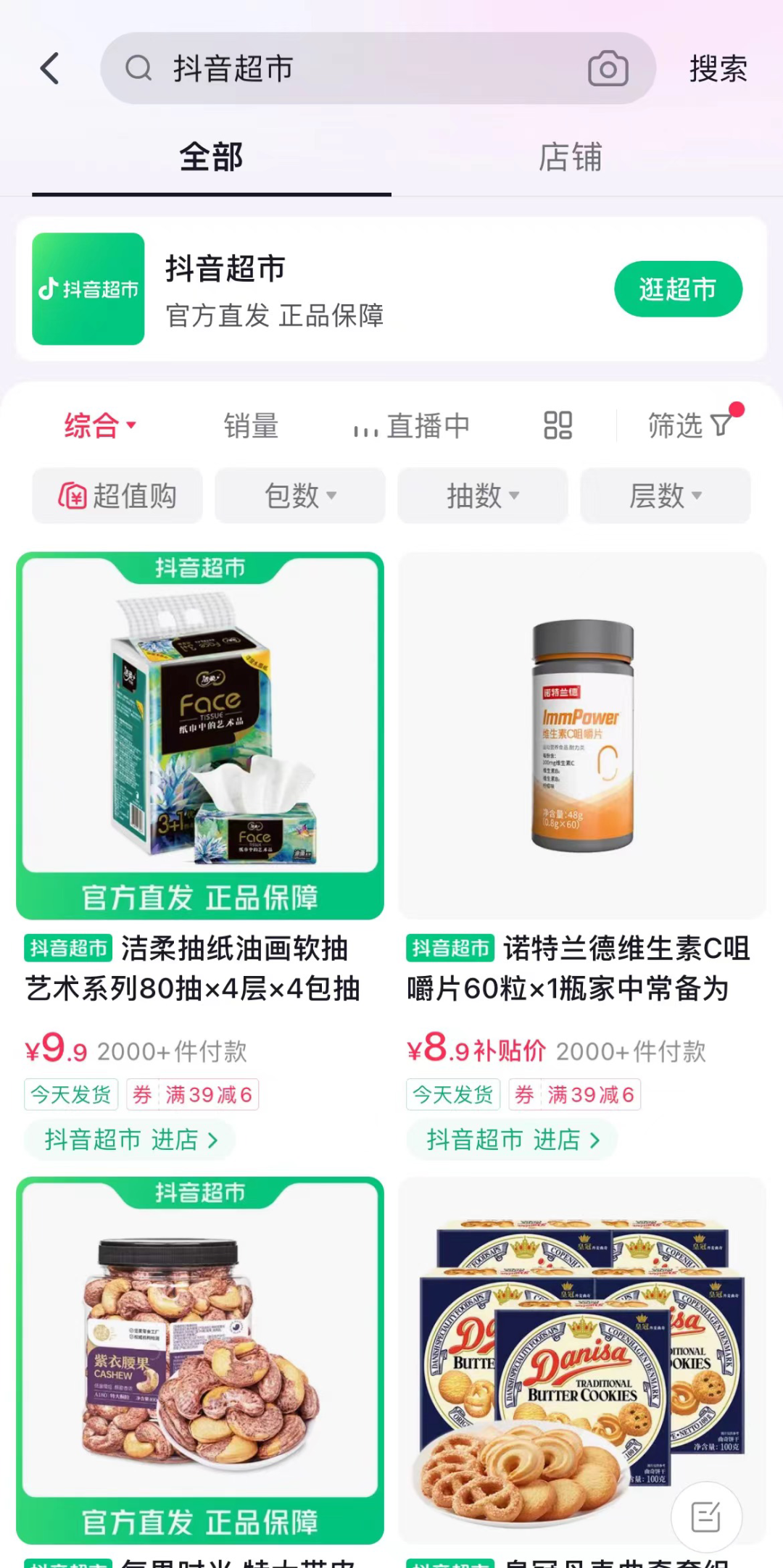 作为新业务,抖音超市在首页并没有明显的入口,即便是在首页的购物页面,也没有超市的导流提示,用户需要在搜索栏检索“抖音超市”,才能找到入口。