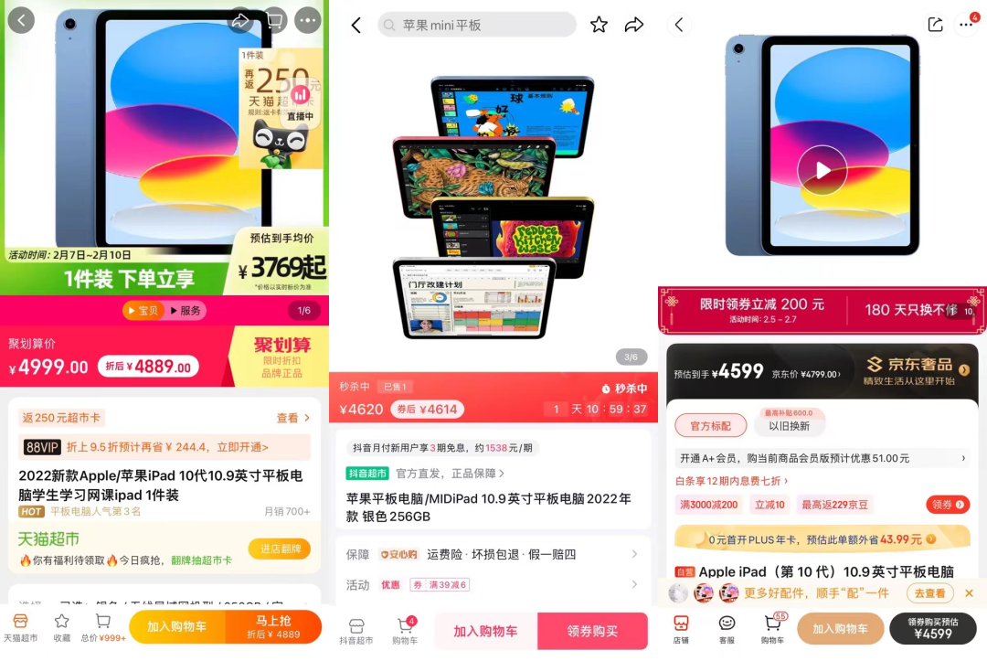 价格上,以2022款256g的iPad 为例,抖音超市券后价为4614元,天猫超市券后价为4889元,并返250元天猫超市卡,实际价格也就是4639元,京东超市并无苹果品类,不过在苹果的京东自营店,该款产品券后4599元。整体来看,将数码电器品类作为主打的京东更具竞价优势,天猫超市和抖音超市价格相差不多,不过天猫超市以超市卡的名义刺激了用户二次消费。