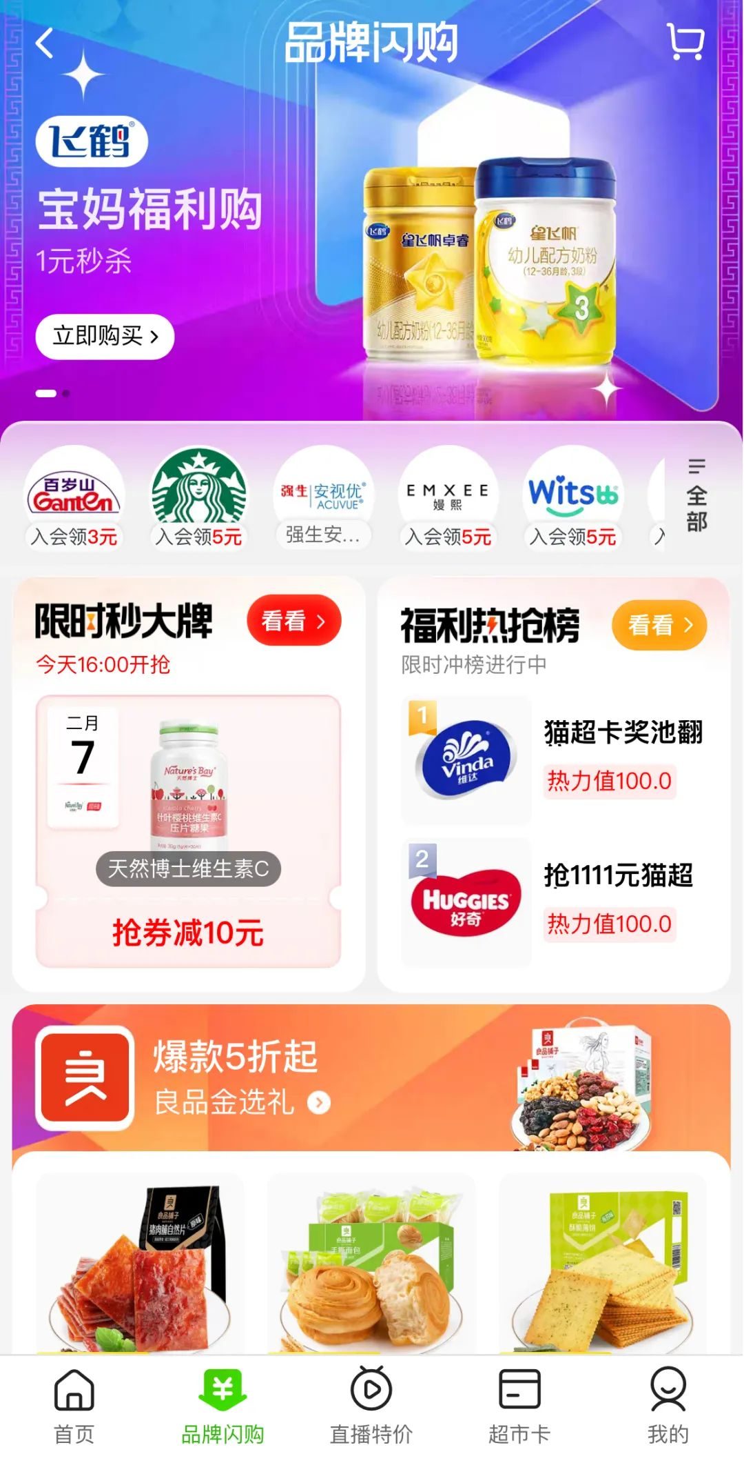 也就是说,自营的模式正在逐渐打破,跟品牌合作成为天猫超市接下来的重点,这一变化直接体现在天猫超市的页面中。在天猫超市的低栏中第二栏是“品牌闪购”,直接导入“品牌馆”,星巴克、百岁山、百事、强生等一众大牌均在首页有推荐位。数据显示,经过近一年的试点,目前天猫超市私域引导成交占比已经超过50%。