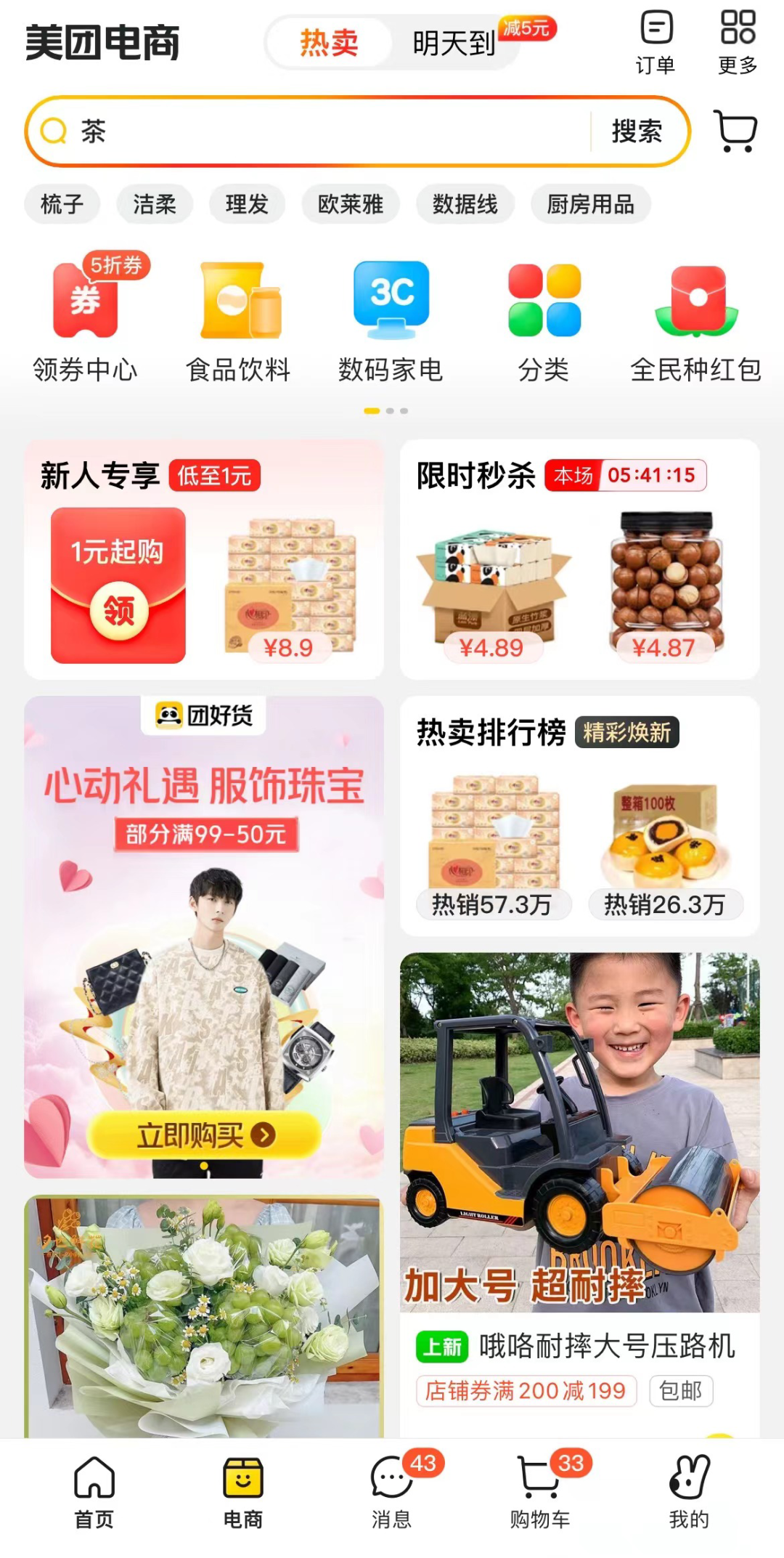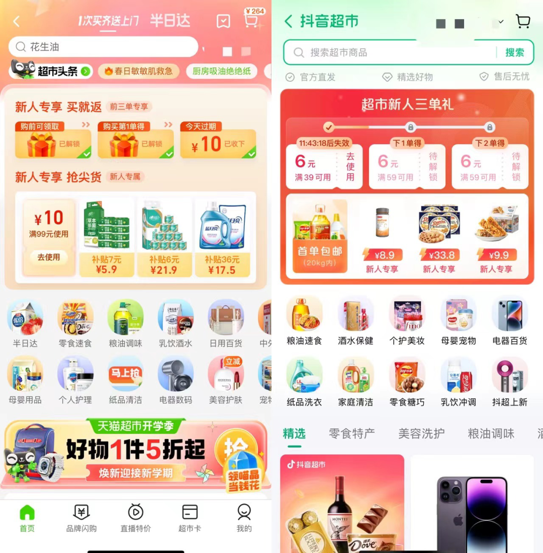 进入页面后,娱乐独角兽注意到,抖音超市跟天猫超市有着极高的相似度,搜索栏都位于页面最上方,其次是新人专区,同样的“新人三单礼”和“新人专享尖货”,接下来同样是品类栏,不一样的是,有着仓储物流优势的天猫超市,将“半日达”放在了头号位。