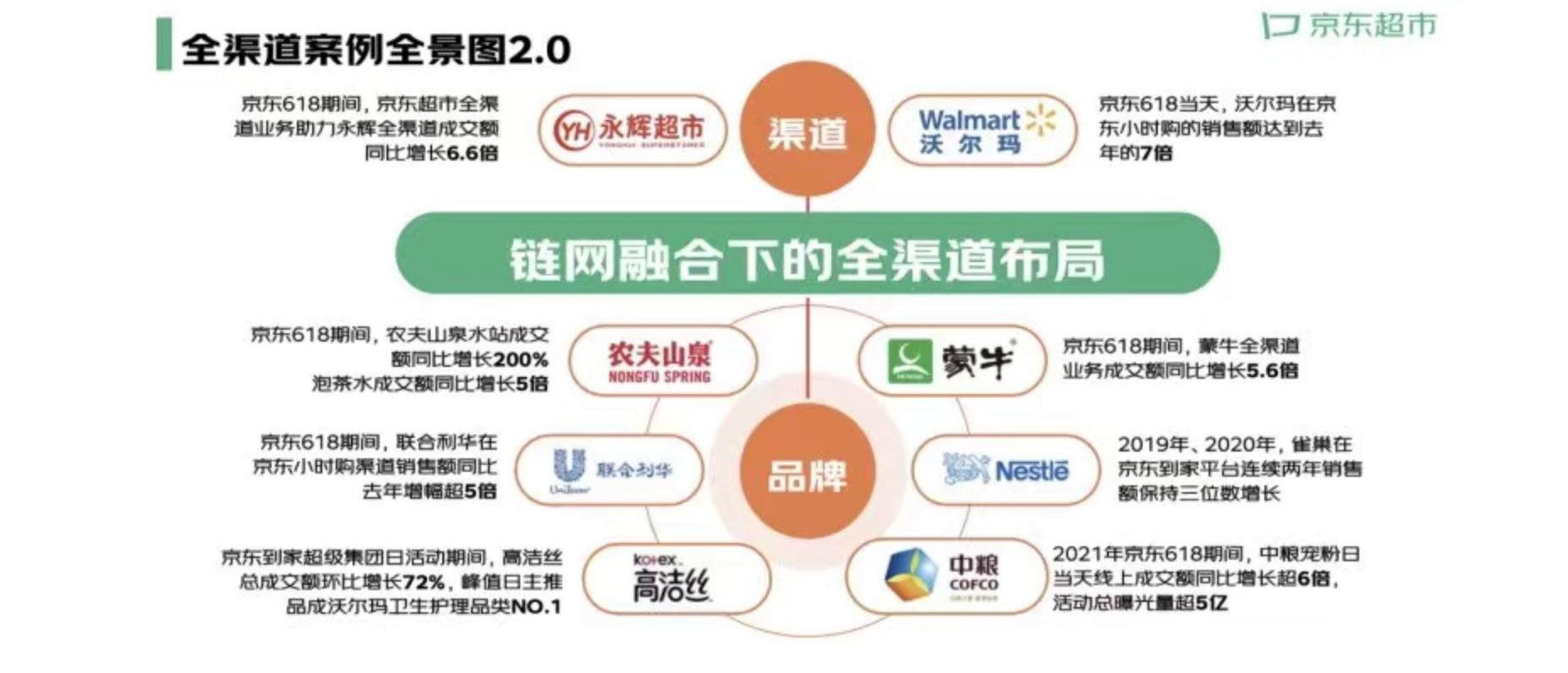 住得注意的是,品牌也成为了京东超市的重点。京东超市发布的“全渠道案例全景图2.0版”,展示了蒙牛、农夫山泉、联合利华、雀巢等品牌在链网融合下的的增长数据。