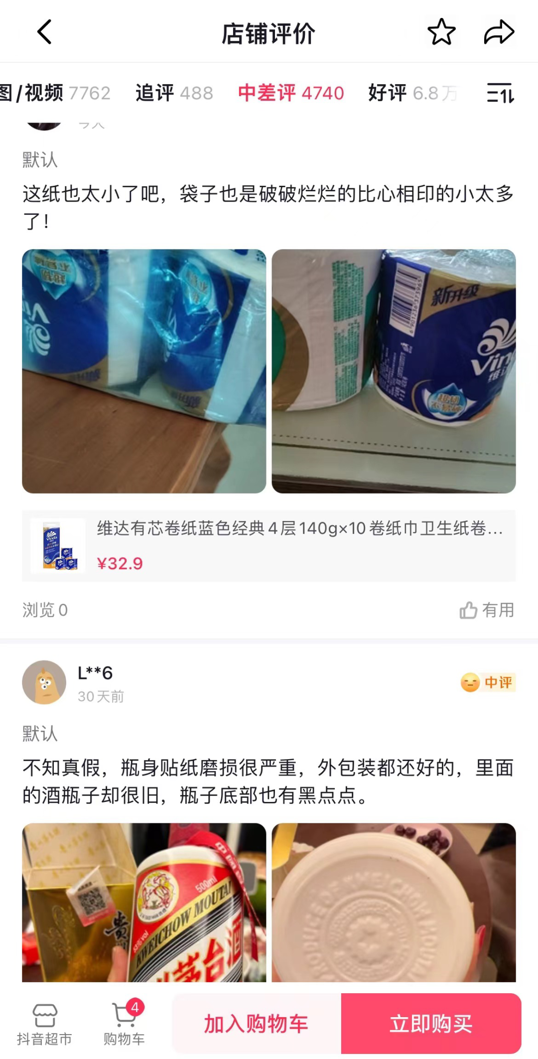 截至目前,抖音超市的店铺评价已有7.3万条,其中好评6.8万,中差评4740条,中差评中大都围绕着包装破损、保质期短、价格无优势、商品品质差等问题。