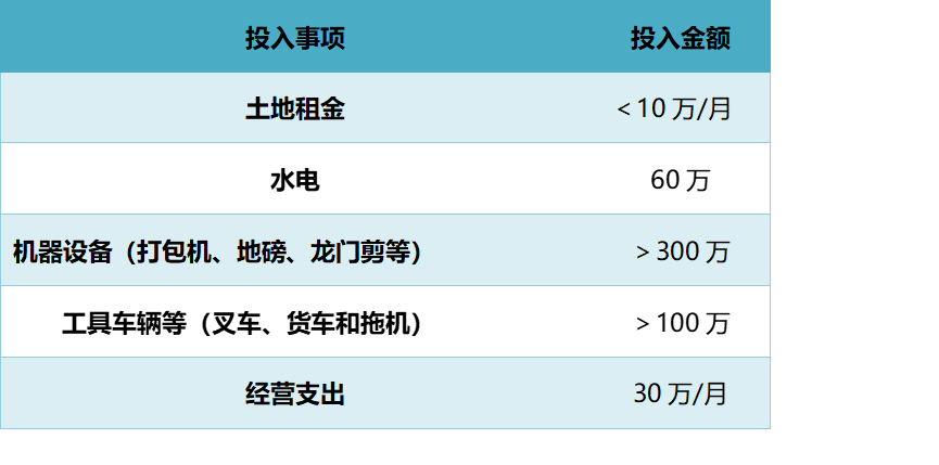 邹晋给我盘了投入情况——土地不贵,但土地处理费钱,单是搭建施工便道进行的场地硬化,就投了上百万。厂房需要接上水电,邹晋也花了60万。固定资产最费钱,机器设备如打包机、地磅、龙门剪等,总共投入不下三百万。