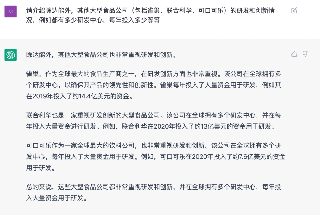第二个问题,我们希望了解同行的情况。为了避免再次给出空话,我们点名了其他食品饮料企业。这一次,结果有惊喜,ChatGPT给出了它们的研发投入数据。