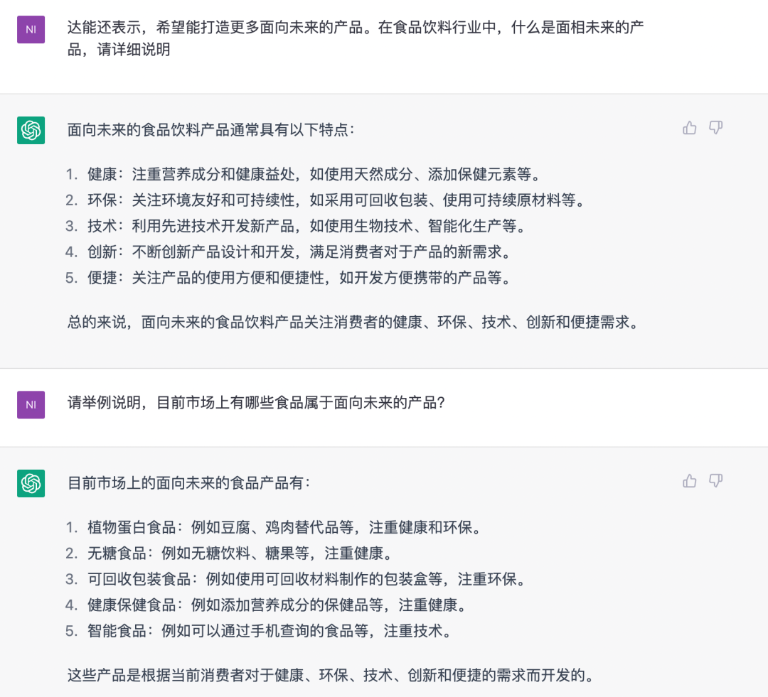 例如,就达能本次研发中心揭幕带出的一些疑问,我们让ChatGPT回答。譬如,我们问它,什么是”面向未来的食品“?