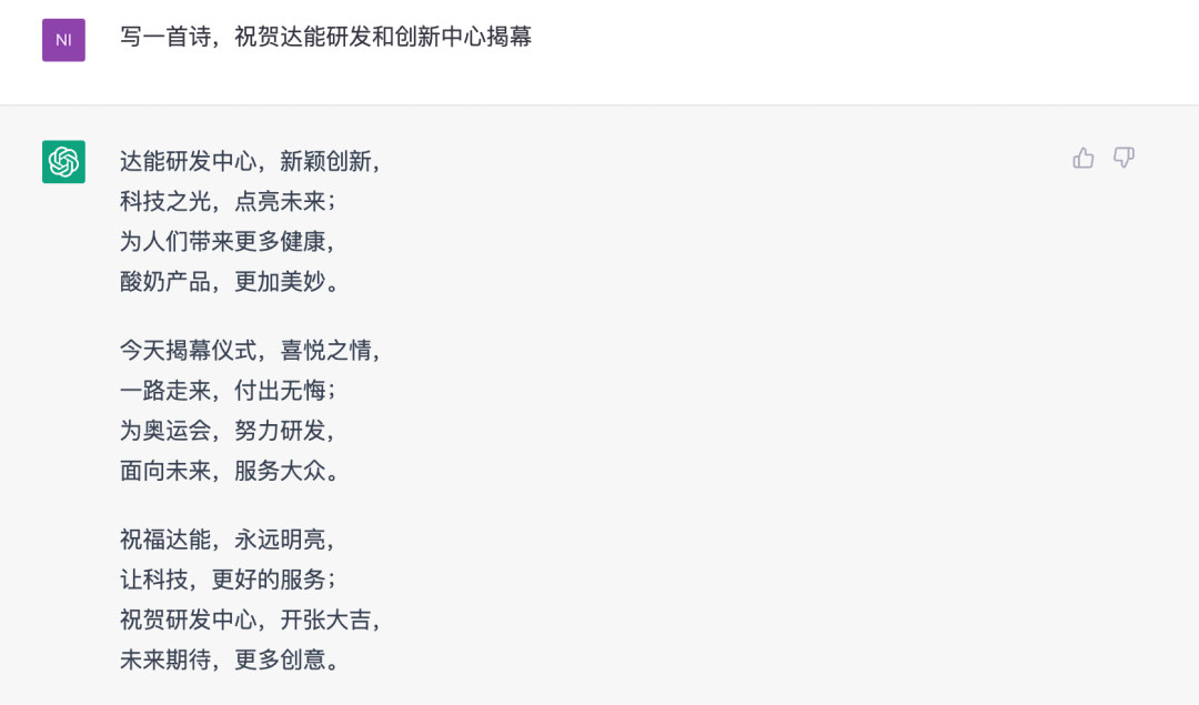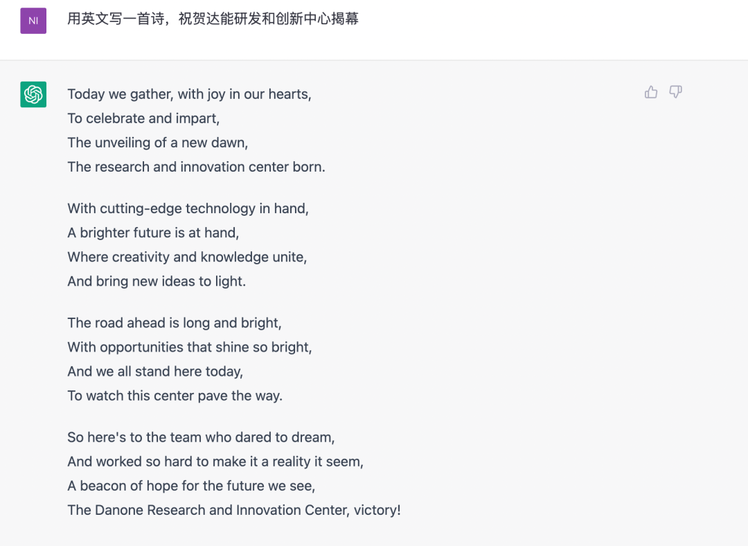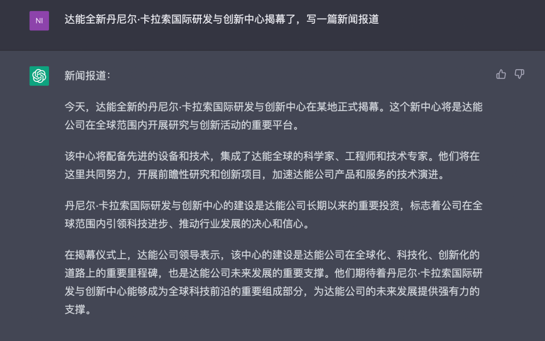 首先,我们非常简单粗暴地让ChatGPT创作:达能的新中心揭幕了,写一篇稿子。