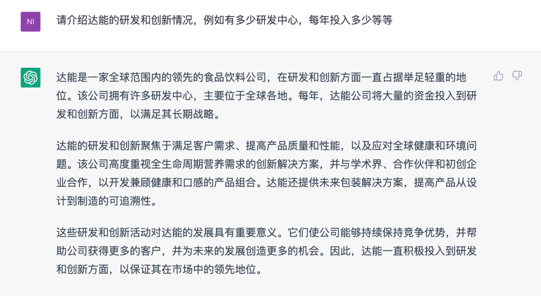 同时,它也成了一个搜索引擎,介绍了一些我们没有给出的信息,例如达能的成立时间,以及2013年达能另一个研发中心的情况(经查证,这两个信息都是准确的,其中2013年达能纽迪希亚研发中心在荷兰成立)。