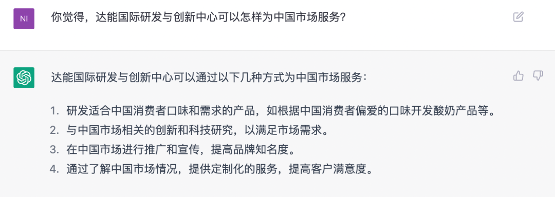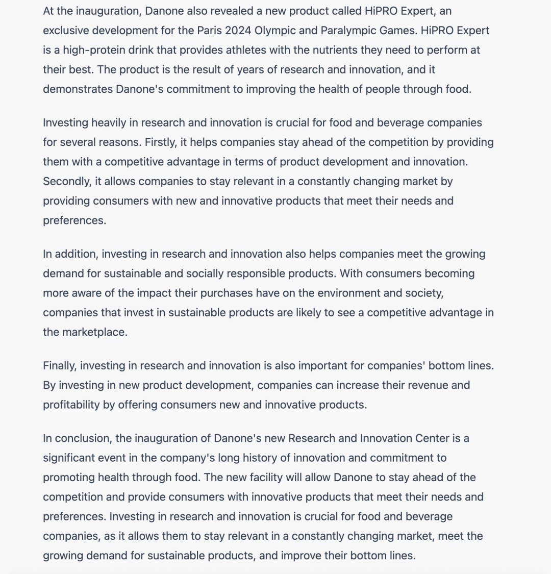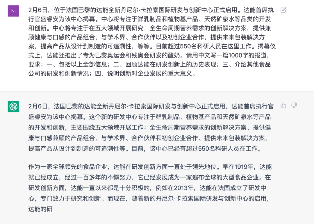 我们在新的对话中,补充了关于研发中心的五大研究领域、专注的品类,并告诉ChatGPT我们需要一篇1000字的稿子,同时要求它回顾达能的创新情况,介绍同行的类似投资和创新对企业的意义。
