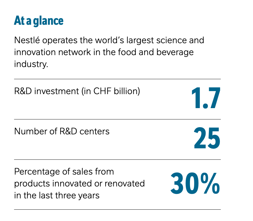 根据雀巢官网的记载,雀巢拥有4100 名研发人员,每年在研发上的投资超过 17 亿瑞士法郎(约18.49亿美元),2019年情况类似:
