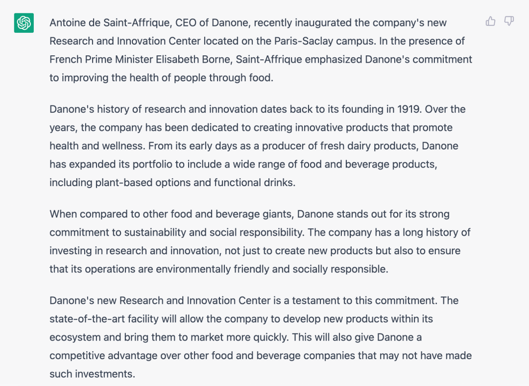 小食代也有一个想法——用ChatGPT来帮我们写稿子。碰巧法国食品巨头达能本周宣布,其位于法国的全新“丹尼尔·卡拉索国际研发与创新中心”揭幕。于是我们也想和达能一起创新,第一次让ChatGPT当小食代的“笔替”。