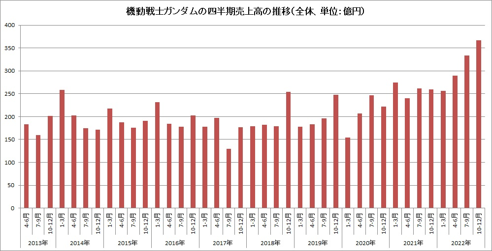 从上图可以看出,今年二三四季度《机动战士高达》单季度销售额屡创新高,二季度单季度销售额290亿日元,三季度销售额334亿日元,四季度销售额367亿日元,再次刷新历史记录,保持持续高增长态势。